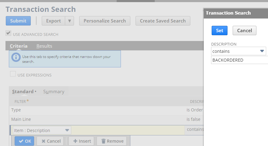 我正在寻找一种在Netsuite中进行搜索或报告的正确方法,该方法搜索销售订单,以查找项目描述中的特定单词。我们目前存在缺陷的系统包括将反向排序的放在对后台项目的描述中。目前,我们使用搜索未完成的项目来查找备份,但这并不真正有效,而且是一种糟糕的方法。必须有一种简单的方法来搜索每个销售订单的商品描述。仅仅搜索商品描述并不能做到这一点,因为这是在商品被放到销售订单之后添加的。Netsuite似乎在销售订单中没有项目描述的概念,但当然它必须存在,因为不管您将它设置为什么,它都将保留下来。我要搜索的内容的正确名称是什么,涉及的语法是什么?