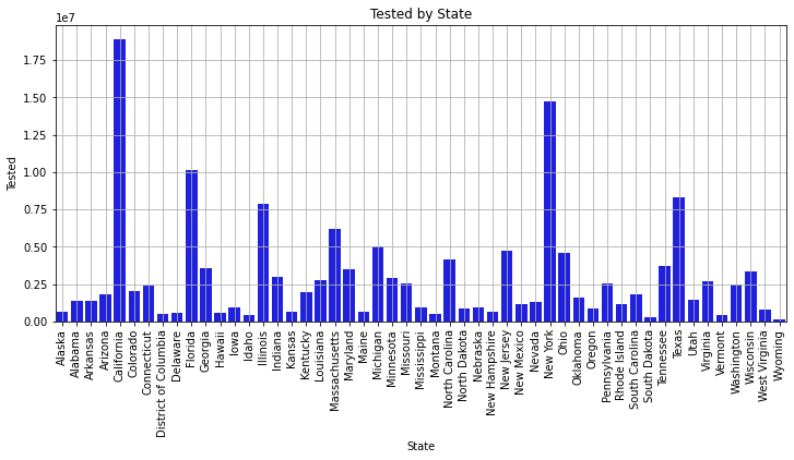 ax = sns.barplot(x = 'State', y = 'Tested', data = data, color='blue');