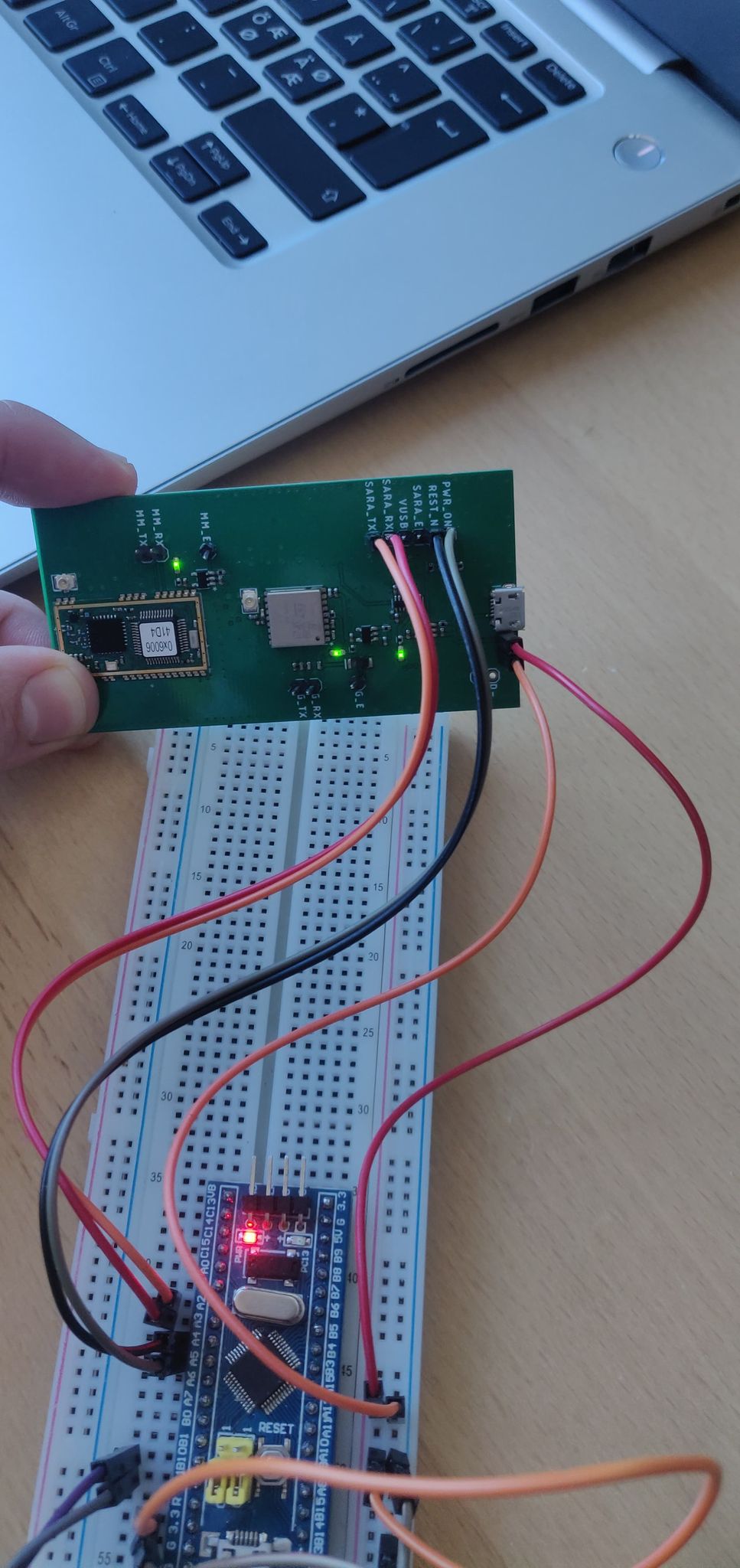我们已经证实,通过与其他模块(如其他ESP)进行交互,布线应该是正确的,而且布线也应该是正确的。电源来自TTL ( 3v3),进入面包板,STM32和SARA R412板从这里获得电源。