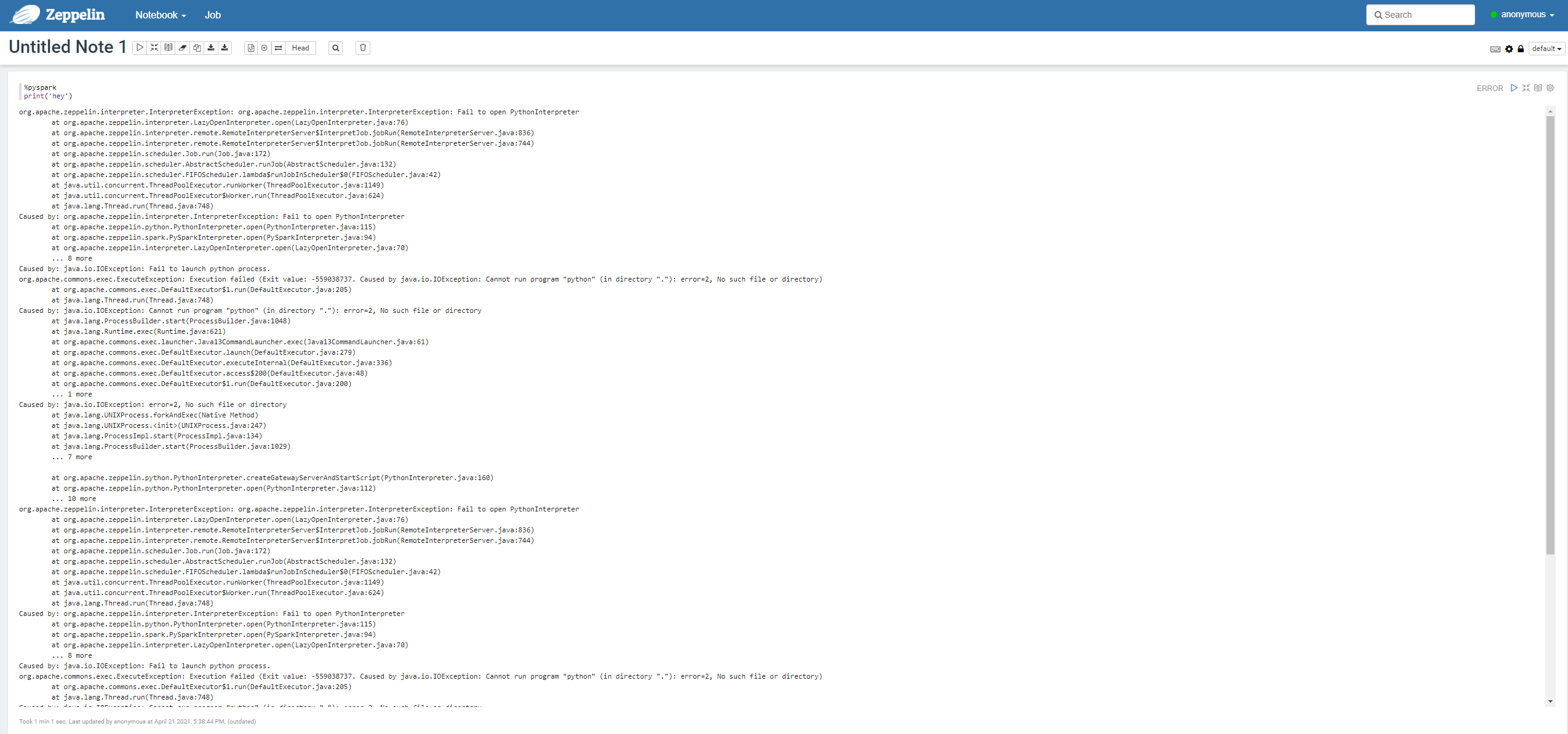 但是,使用Zeppelin %Pyspark和%python都不能工作。我已经搜索了很多小时了,但是还没有找到解决方案(从Debian切换到Ubuntu,然后再回来)。