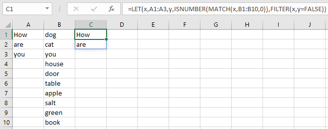 =LET(x,A1:A3,y,ISNUMBER(MATCH(x,B1:B10,0)),FILTER(x,y=FALSE))名字经理试着-