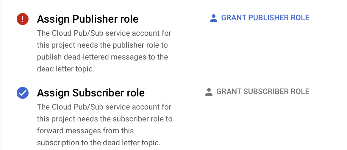 这个主题应该有一个“死信”主题,其中无效的消息结束。然而,每当我通过Terraform配置它时,google云控制台就会提到,我没有将“订户”和“publisher”角色附加到我的项目公共服务帐户:
