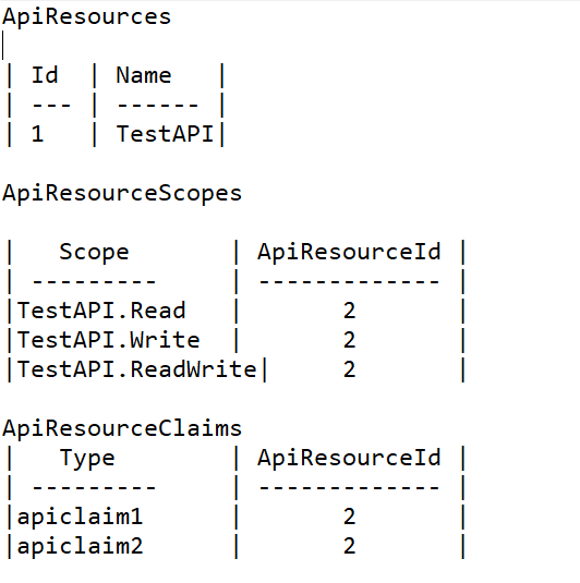 我的理解是,我们可以为API设置使用1-5个表,也可以使用6-8个表。我试过用1-5桌。ApiResources、ApiResourceScopes和ApiResourceClaims中的增加值但低于错误值