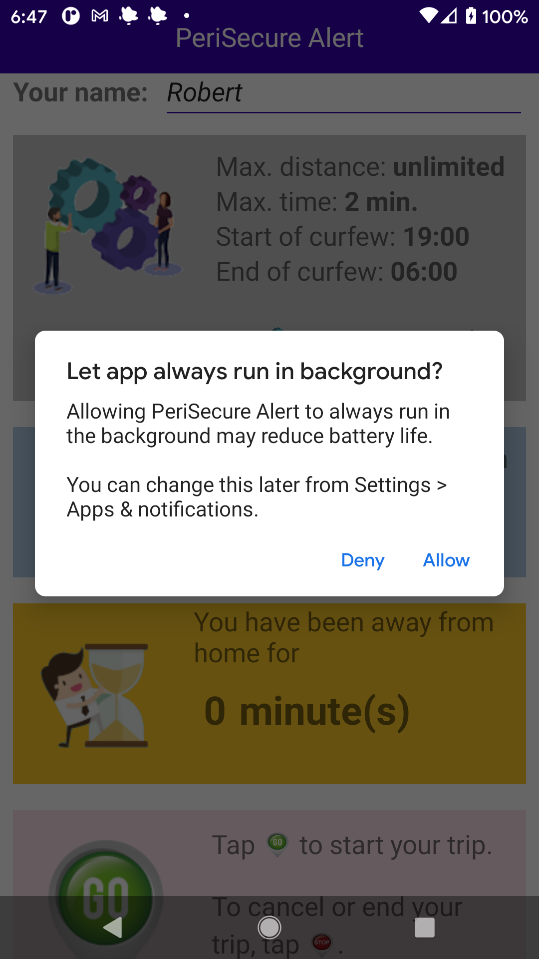 顺便说一句,我还把这个应用程序设置为没有经过优化的电池寿命后,在不同的网站上,这将确保应用程序将继续运行。从我所读到的每一件事来看,我做的一切都是正确的,但我仍然无法让它发挥作用。我在Pixel 2上运行Android 11。我知道Google限制了Android后期版本的前台处理,但将应用程序设置为不优化电池寿命应该可以解决这个问题,不是吗?为了安全起见,当应用程序启动时,它要求用户批准后台操作: