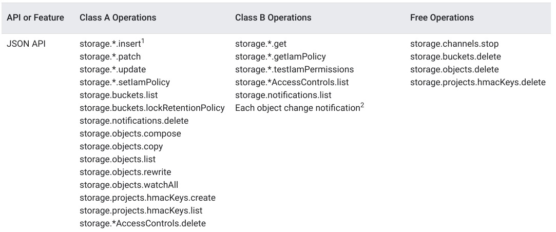 在操作B列中,第一个方法是storage.*.get。在其他列中没有其他get方法,这意味着从桶(读取元数据)或对象(通过代码读取文件、下载文件等)中检索信息。在桶内将被视为此方法的一部分。
