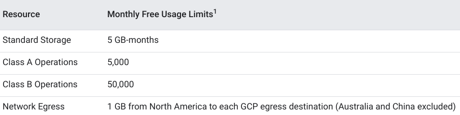 这意味着:如果在整个月中,在标准类桶中存储的GBs少于5,000 1GB,则执行的B类操作少于50,000次,A类操作少于5,000次,通过网络发送的内存不足1GB,则不会支付任何费用。
