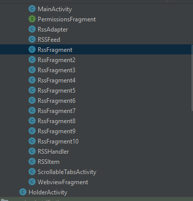 }现在,您可以在您的RssFragment中重用ScrollableTabsActivity类,而不是为每个ScrollableTabsActivity字符串创建片段类,如下所示: