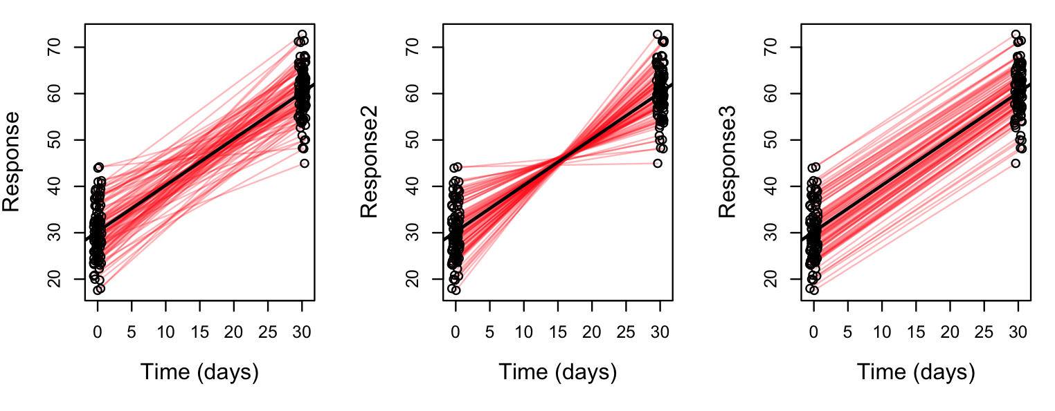 lm(response~time)、lm(response2~time)和lm(response3~time))估计的。我遗漏了什么?