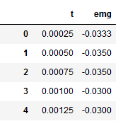 我的数据是带有(50858, 2)形状的t和emg列的EMG信号,其中emg是要去噪的值。这是它的头。