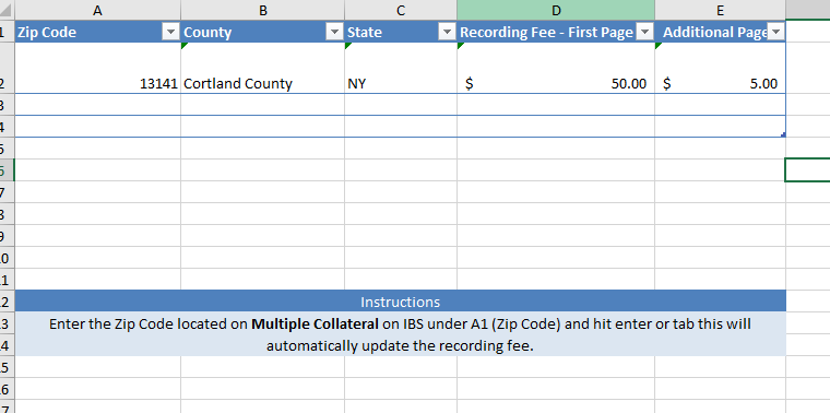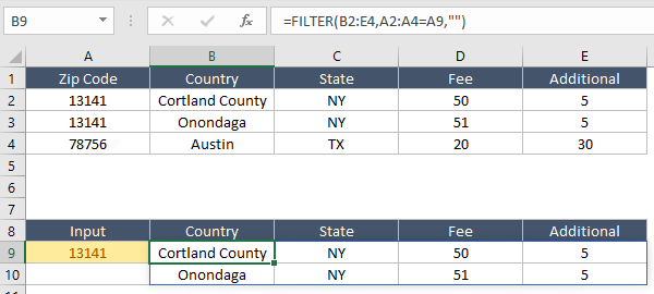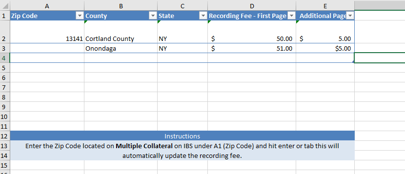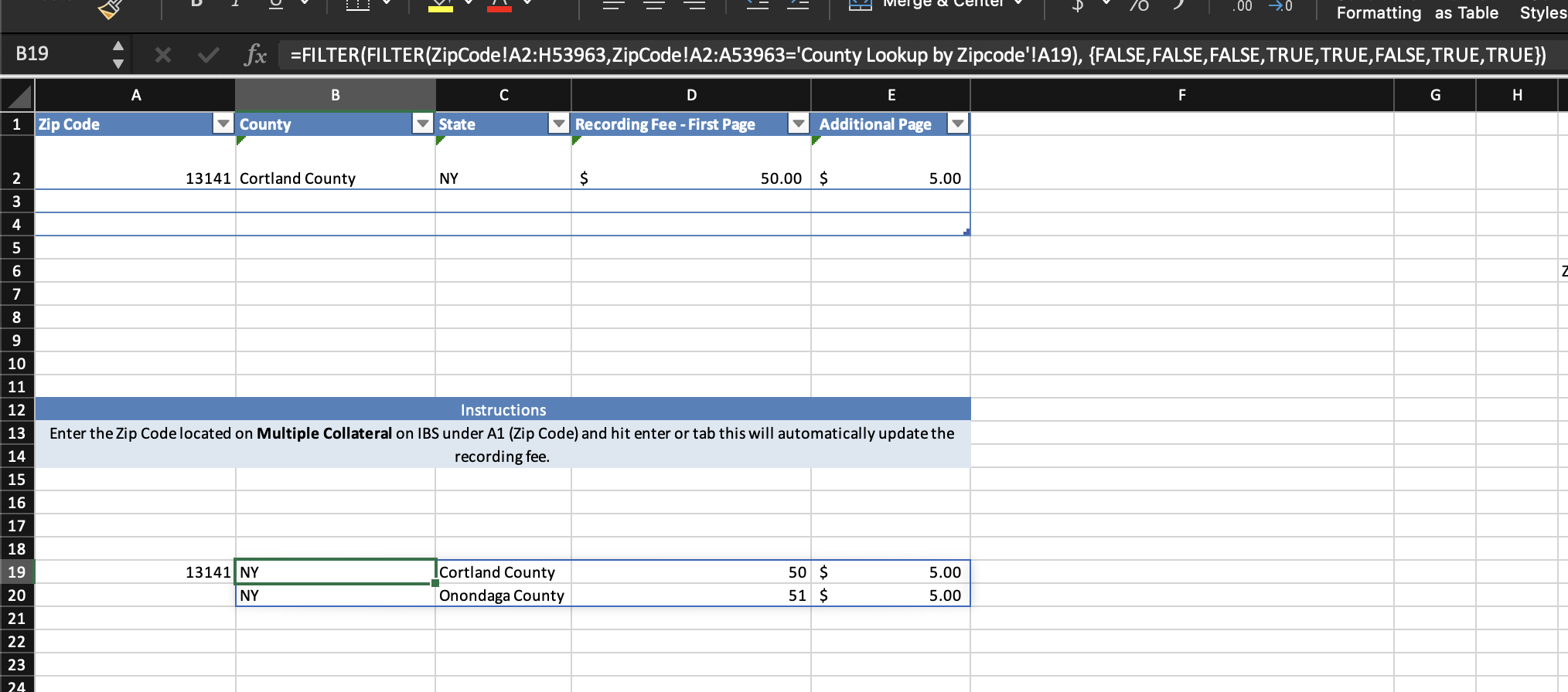 例如,Zip代码1314包含以下县-康特兰和奥农达加。我试图让excel显示这两个一旦邮编已经输入和他们相应的费用。