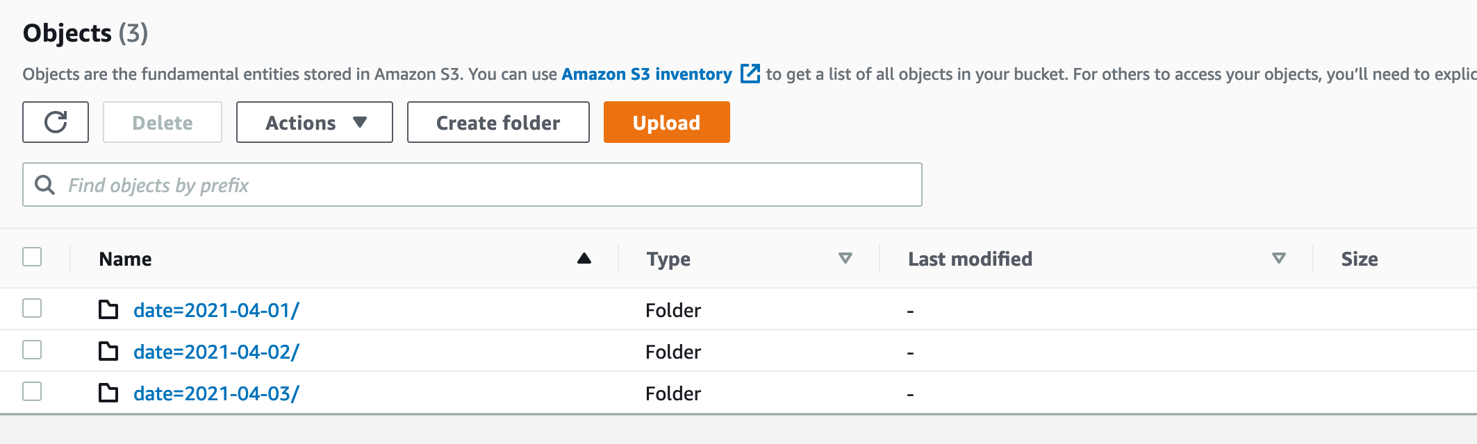 #> 's3://bucket-name/folder/date=2021-04-03/': ['2021-04-03']}}然后,可以在控制台中查看S3数据:
