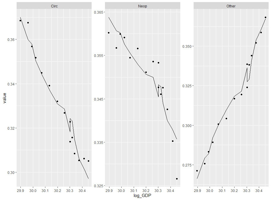非光滑性的问题是计算Pr(y=m|X) = f( x1,x2),即预测概率是x1和x2的函数。然后,您将Pr(y=m|X)绘制为GDP的单个x变量日志的函数。这一结果几乎肯定不是一帆风顺的。log_GDP和log_h变量是高度负相关的,这就是为什么结果不是比它更多的原因。