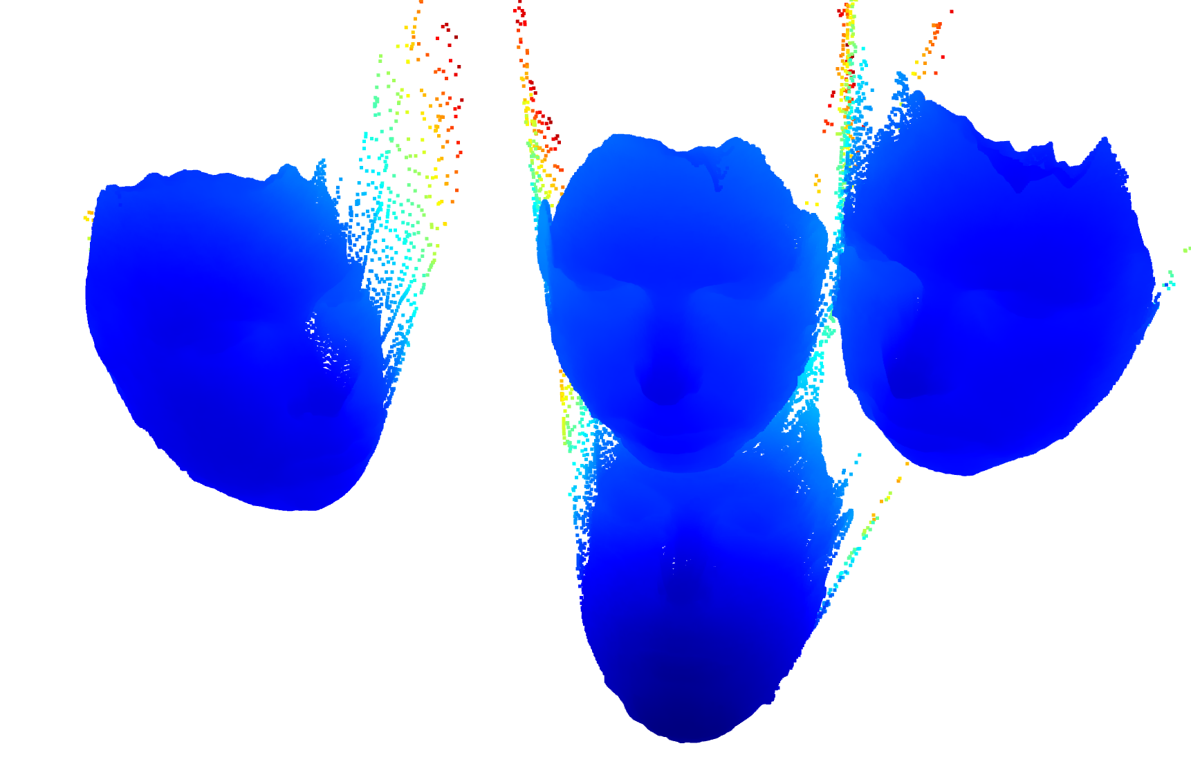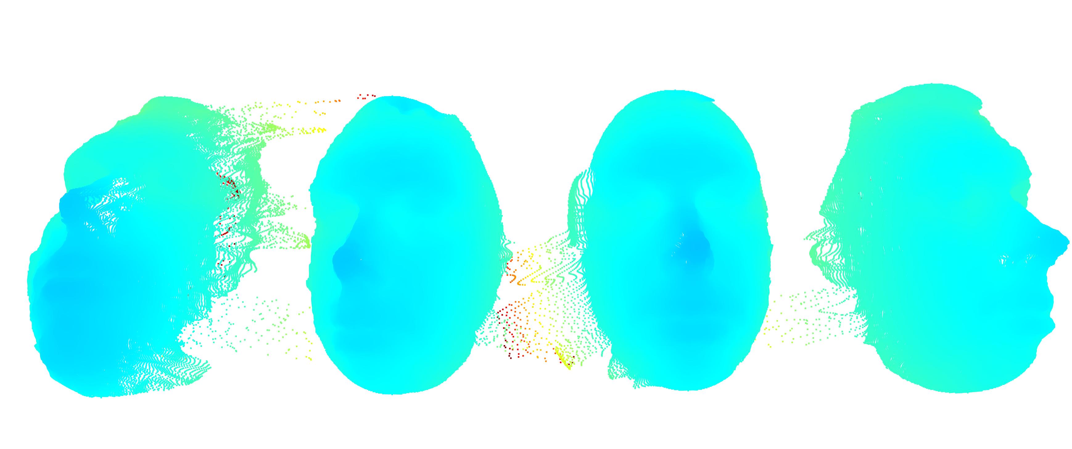 使用带有iPhone传感器的TrueDepth相机,我能够在我的面部图像中获取精确的深度数据。我是从前面,左和右(大约30度旋转)的深度和头部倾斜一点,以捕捉下下巴(总共4深度图像)。我们只是在这里捕捉深度,所以没有颜色信息。我们使用椭圆框来裁剪不重要的数据。