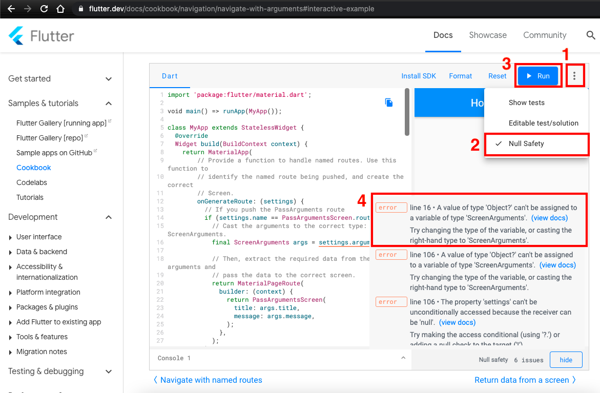 我已经看到了使用参数导航的官方文档,当我在Interactive示例部分切换到null安全时,它也显示了错误。看这张截图或者自己试一试。