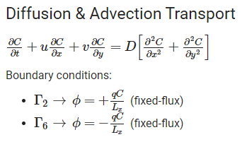 其中q是流动(常数),h是深度(常数),C是浓度(瞬态),Lx和dx是经度(常数)。