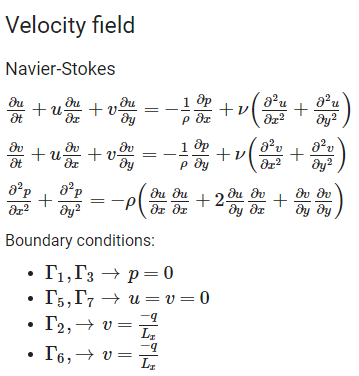 首先,定义了计算速度场的方程(二维Navier方程).特别是,我在表面施加压力=零,在抽吸/排放区(与泵的公称流量有关)施加垂直速度,在底部施加速度=零。