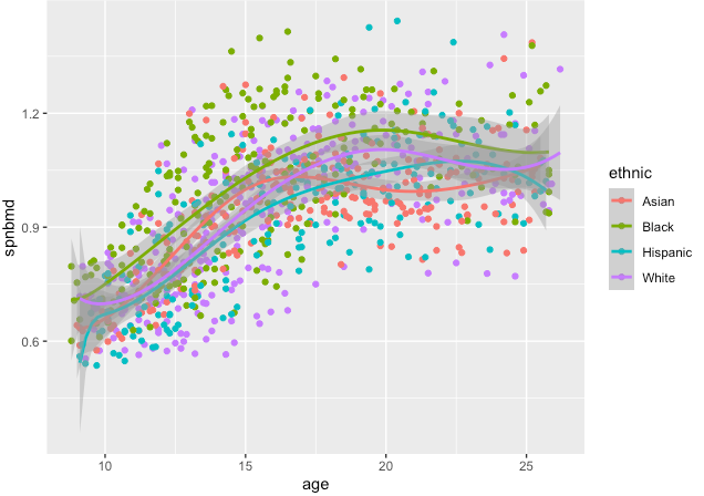 ggplot(bone) + aes(age, spnbmd, color=ethnic) + geom_point() +