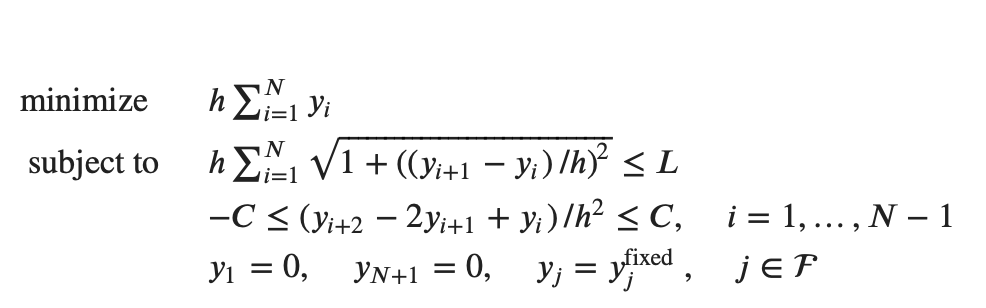 cp.abs(( y[i+2] - 2 * y[i+1] + y[i]) / h**2) <= C for i in np.arange(1,199) ] #not using the first constraint here约束有for循环,当我试图根据CVXPY文档描述问题时,我得到了以下错误