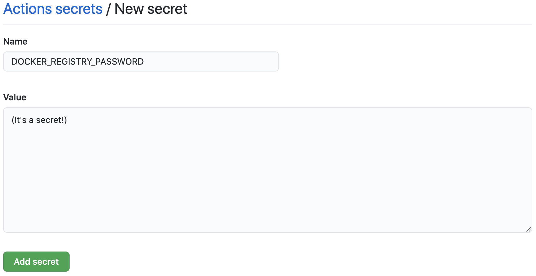 您已经添加了一个带有码头注册密码的存储库秘密(为了一致性起见,让我们使用DOCKER_REGISTRY_PASSWORD) )