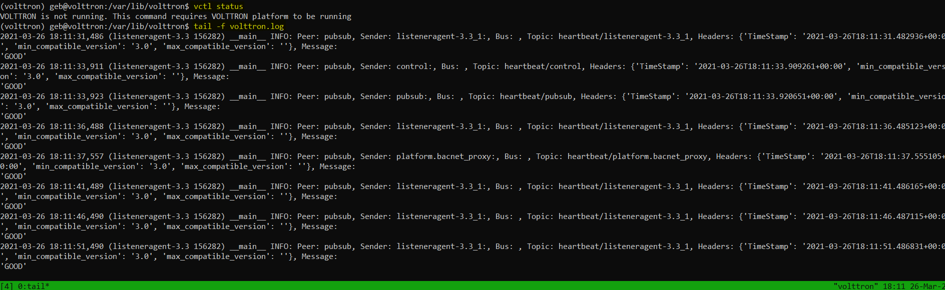VOLTTRON is not running. This command requires VOLTTRON platform to be running但如果我做的tail -f volttron.log伏特管显然是在后台运行,我可以看到所有的BACnet信息,等等。见下面的日志截图。知道发生了什么事吗?我会重新启动电压边缘设备吗?