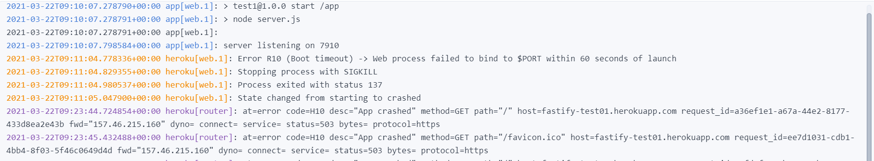 我有一个与Heroku一起托管的简单Fastify服务器。但是,它似乎不起作用!但是,在发展的过程中,一切似乎都很好!我得到的错误是:Error R10 (Boot timeout) -> Web process failed to bind to $PORT within 60 seconds of launch。我得到的完全错误: