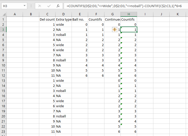 =COUNTIFS(D2:D$2,"<>Wide",D2:D$2,"<>noball")-COUNTIF(C2:C$2,1)*6+6(每次重新开始时减去6次)