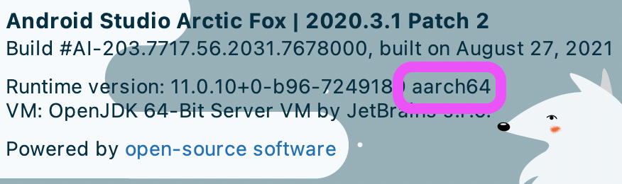 要检查您是否为M1使用了正确的Android,请单击“关于Android”并检查运行时,它应该显示为aarch64 (即。Arm架构64位)。如果不是,如果您安装了普通Mac的Android,大多数情况下您可能会安装x86_64。