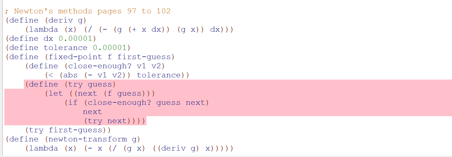(define (newtons-method g guess) (fixed-point (newton-transform g) guess))请告诉我你的想法是什么。我对工具和语言都很陌生。谢谢!