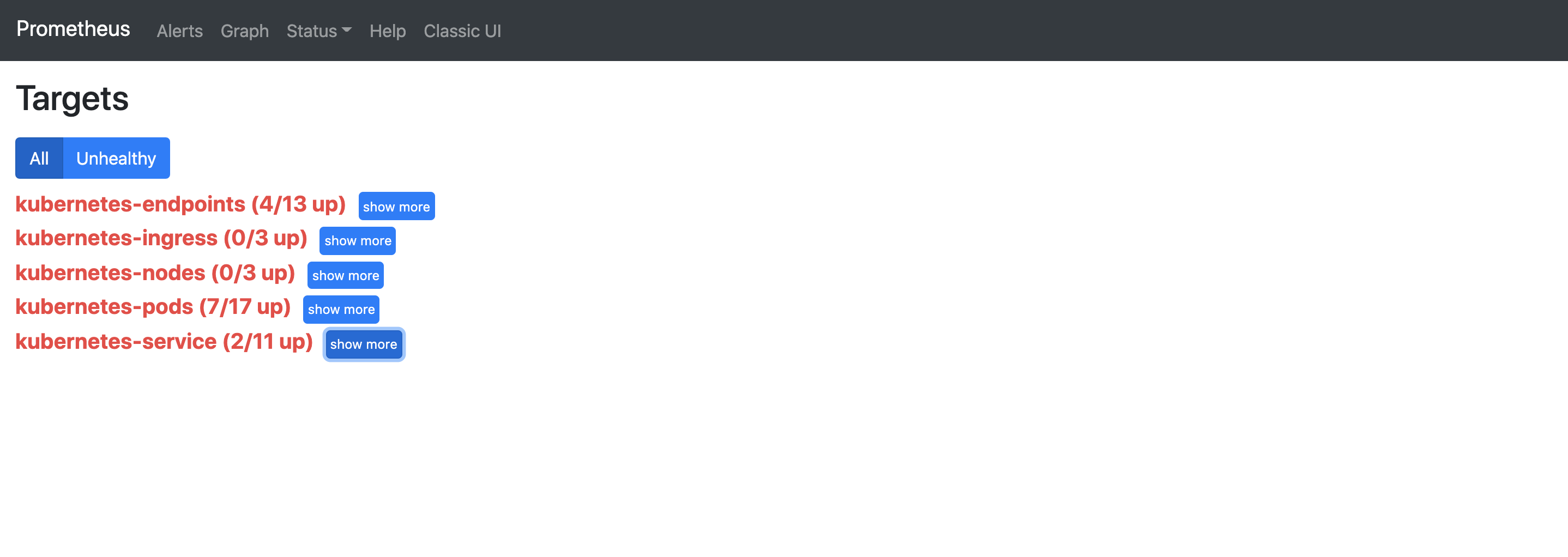 name: prometheus-conf无论如何,prometheus相关的服务和入口已经创建,我可以访问prometheus webUI,但是服务发现页面中有这么多不健康的目标。