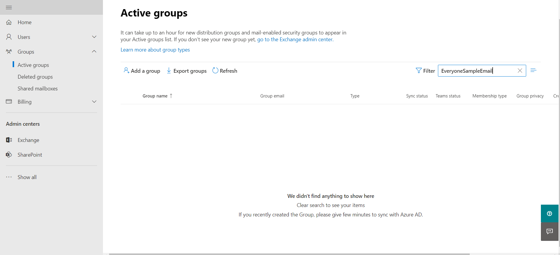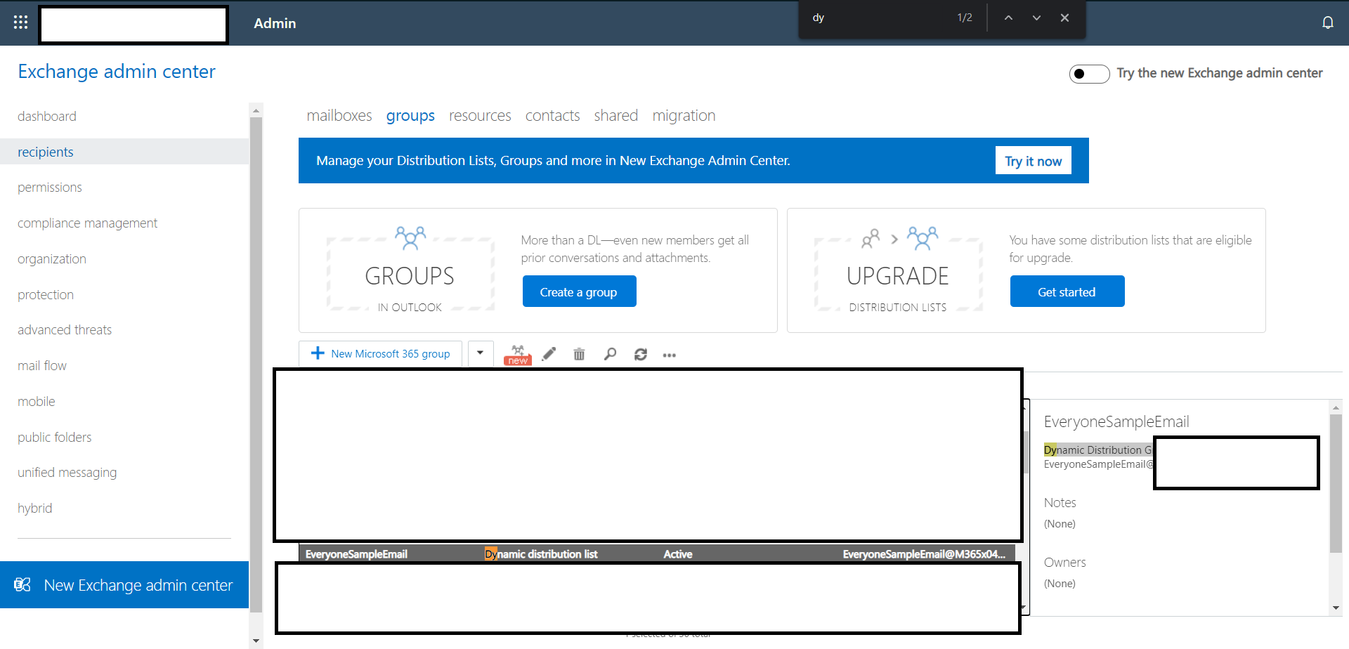 我在我的exchange online中创建了一个动态分发列表(这应该可以容纳我所有的员工,我正计划在我的Power中使用它),但是在创建了3个小时之后,它仍然没有出现在我的M365管理中心。有人知道它是否会出现在这里,如果会的话,需要多长时间?