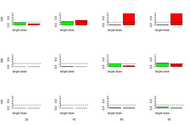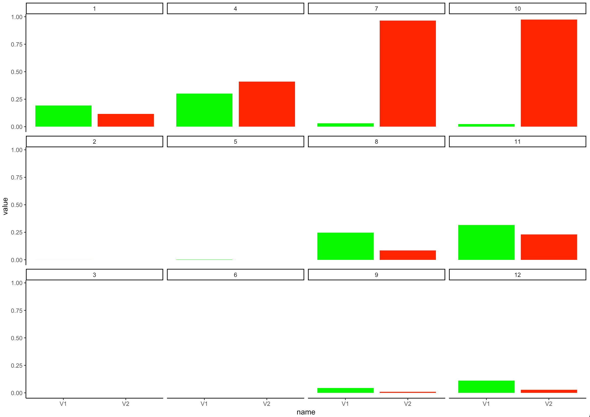 V2 = c(0.1160, 0.0000, 0.0000, 0.4092, 0.0000, 0.0000, 0.9658, 0.0836, 0.0092, 0.9746, 0.2312, 0.0284)我使用for循环、par和base::barplot绘制如下所示: