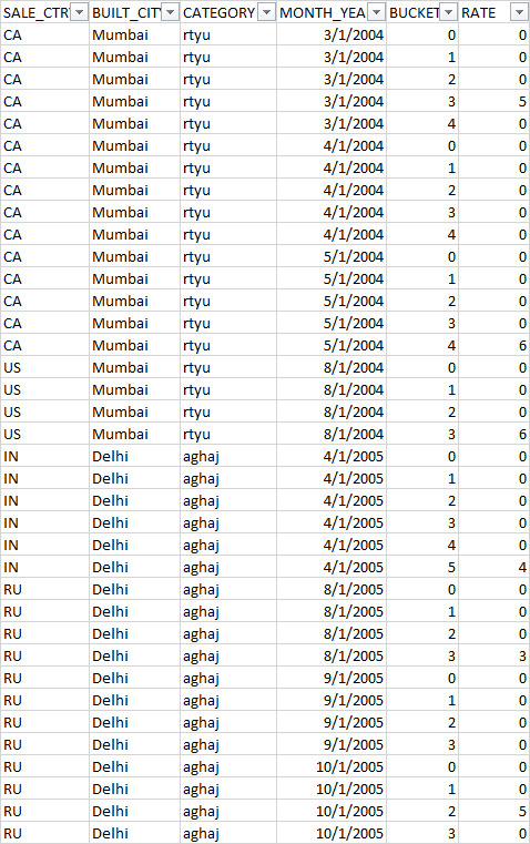 当我只有4列,如类别,MONTH_YEAR,桶,速率,然后我填入如下代码