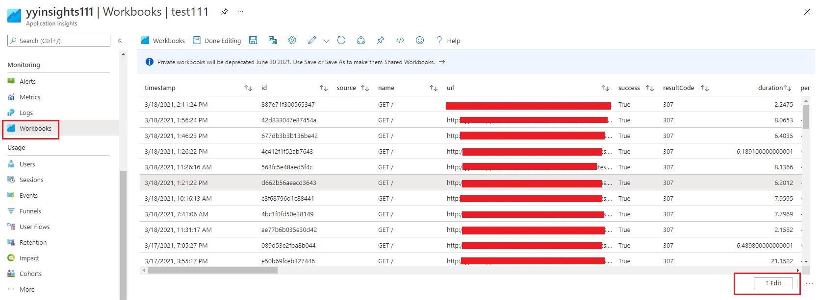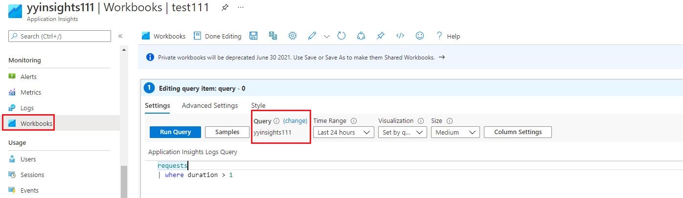 6.在新页面中,单击“更改”按钮,以选择另一个应用程序洞察。然后,查询将基于新选择的应用程序洞察力: