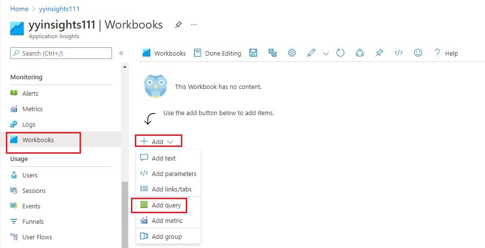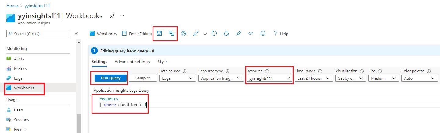 3.在新页面中,您可以从Resource dropdown ->中选择一个应用程序洞察,然后编写查询代码->,然后单击"Run Query“按钮检查结果->单击Save按钮保存工作簿: