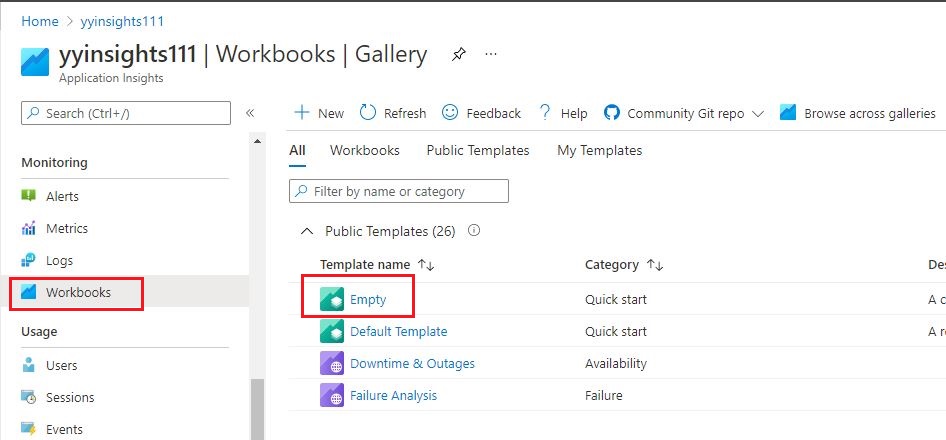 1.NAVtoazure门户-> --您的应用程序洞察力之一->单击工作簿->创建一个空模板: