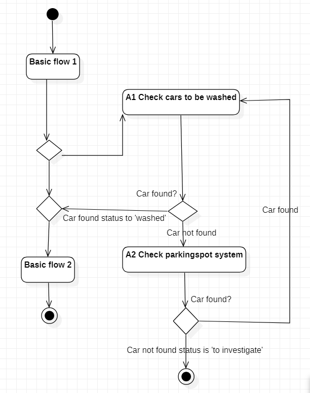 (当步骤A1.1找不到汽车时,它应该在状态=‘调查’之前检查停车系统),我在用例模板的特殊需求部分中描述了这个部分。