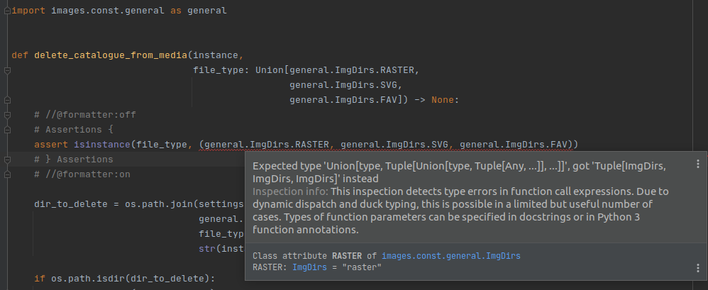 PyCharm抱怨(general.ImgDirs.RASTER, ...)不符合isinstance的预期签名,后者如果由Union[type, Tuple[Any, ...]]组成,则接受元组。