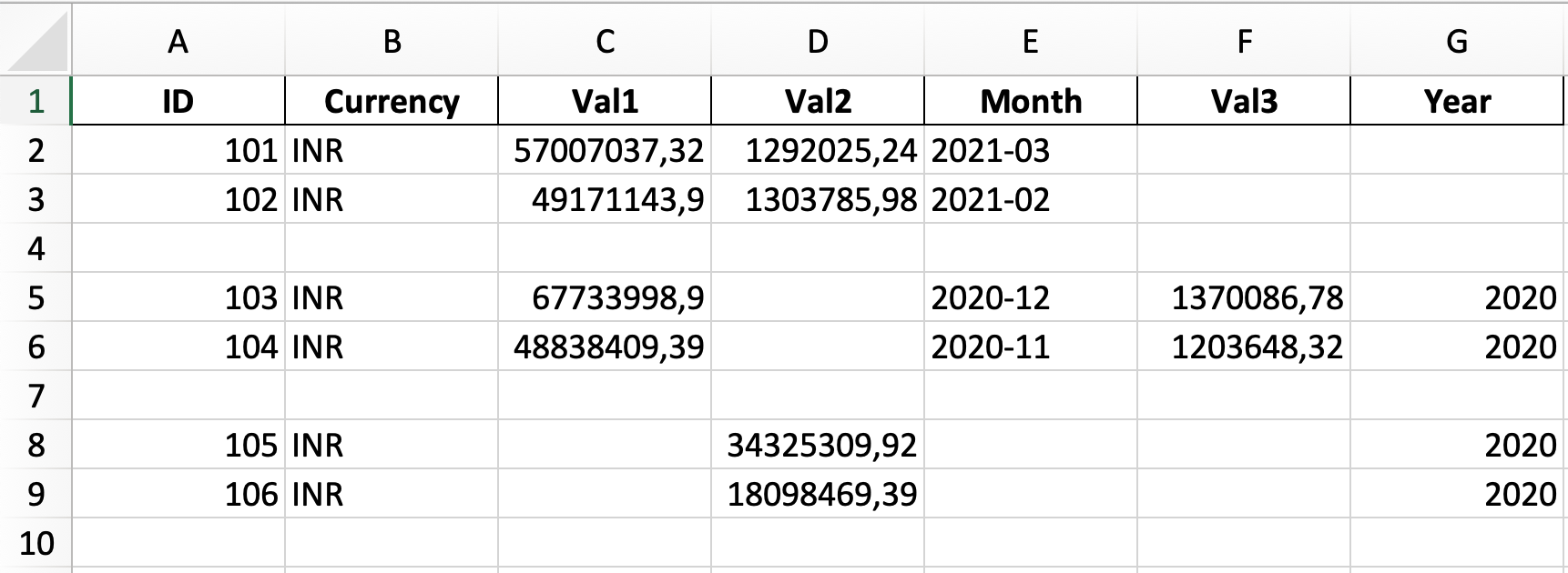 104 INR 48838409.39 1203648.32 2020-11现在,我想把下面的空行写进excel单张中。