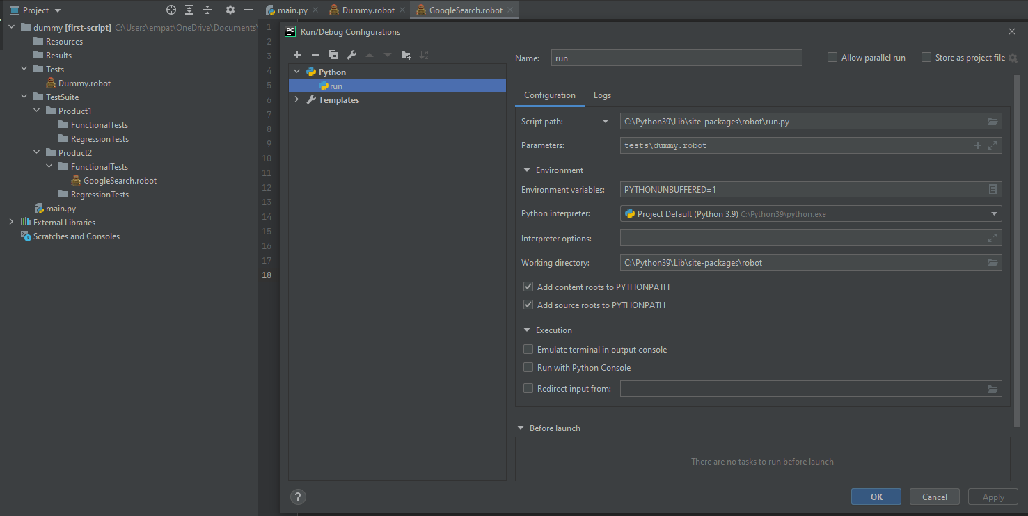 我想,通过你的终端图片,看起来你有一个虚拟环境:(基地)。正如@TodorMinakov建议的那样,在终端路径中启动命令pip list (与图中所示的路径相同)。如果机器人框架库存在,那么它应该是好的。然后尝试命令python -m robot -d results tests/dummy.robot,但是如果lib不在文件夹中,则必须从终端为它们安装pip,以便正确安装(这意味着在虚拟env中工作时,安装的lib位于您的本机目录中)。