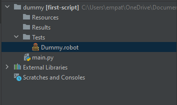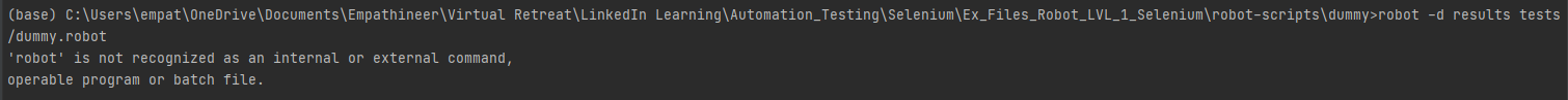 问题:,我正试图通过cmd行:robot -d results tests/dummy.robot在终端中运行我的Dummy.robot测试脚本。然而,它返回的错误‘机器人’是公认的内部或外部命令。我感觉到robotframework可能没有正确安装或位于正确的目录中,因为在运行之前已经检测到关键字"Open“(见下文)为无效语法。