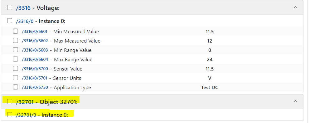 我在(26241-32768)范围内创建了几个自定义对象。根据OMA注册表规范,我们不必注册自定义对象,这些对象在26241-32768之间。我使用过lwm2m Leshan1.0服务器和lwm2m爱荷华1.0客户端。当这些自定义对象显示在Leshan服务器UI中时,对象和实例的名称将无法正确显示。如所附图像所示,对象名称和实例名称没有正确显示。是否可以在服务器UI中显示对象和对象实例的名称而不向OMA注册自定义对象?还有其他在服务器中显示名称的可能性吗?