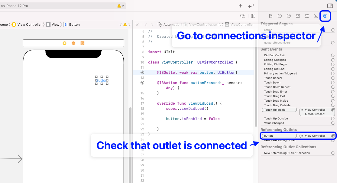 确保你的插座是连接的。您可以通过转到故事板,然后打开出口连接面板进行检查。