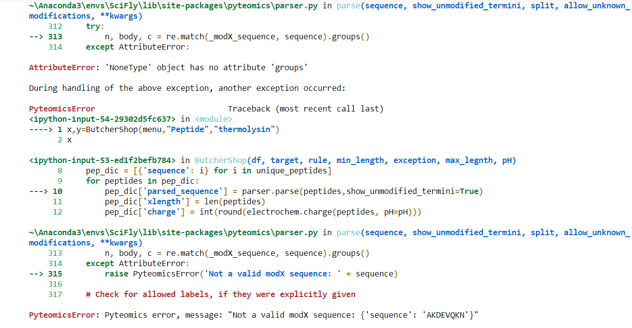 我得到了这个错误:PyteomicsError: Pyteomics错误,消息:"Not序列:{'sequence':'AKDEVQKN'}"
