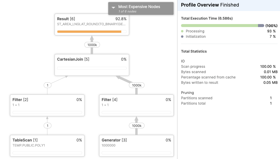 from poly1, TABLE(GENERATOR(ROWCOUNT=>1000000));这个查询应该花更长的时间(找到多边形的区域听起来比选择它更复杂),但是结果证明它只花了7秒(~一半)。