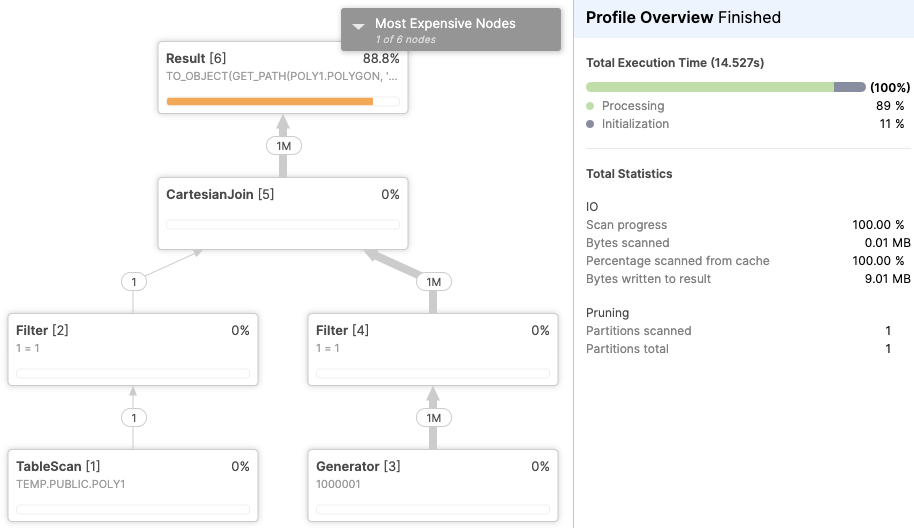 from poly1, TABLE(GENERATOR(ROWCOUNT=>1000000));这需要14秒,在查询分析器中,您可以看到大部分时间都花在了内部TO_OBJECT(GET_PATH(POLY1.POLYGON, '_shape')上。