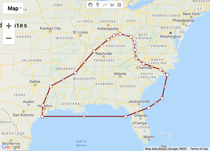'LINESTRING(-95.75122850074004 28.793166796020444,-95.68622920563344 30.207416499279063,-94.5162418937178 32.56537633083211,-90.94128066286225 34.24734047810797,-88.17881062083825 36.812423897251634,-86.13133282498448 38.15341651409619,-85.28634198860107 38.66275098353796,-84.37635185711038 38.789523129087826,-82.84886842210855 38.4848923369382,-82.32887406125734 37.820427257446994,-82.26387476615074 36.96838022284757,-82.03637723327772 36.00158943485101,-80.99638851157454 35.34155096040939,-78.52641529752944 34.62260477275565,-77.51892622337955 34.005211031324734,-78.26641811710381 31.1020568651834,-80.24889661785029 29.926151366059756,-83.59636031583283 28.793166796020444,-95.75122850074004 28.793166796020444)'