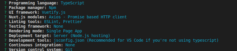 npx create-nuxt-app content-project && cd content-project,下面是我的配置。