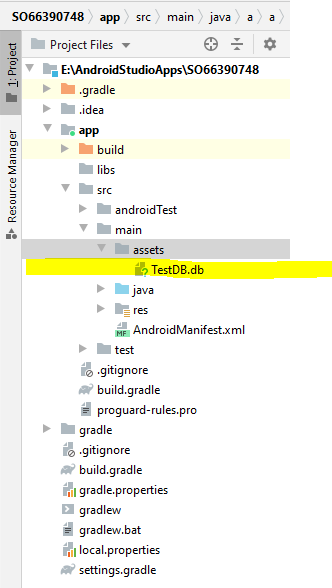 然后在Android中测试项目文件结构,以确认数据库是否存在于资产文件夹中: