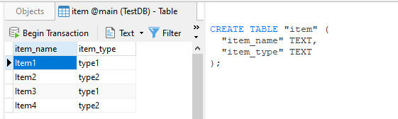 数据库是用一个表(即item )创建的,该表有2列,即item_name和item_type