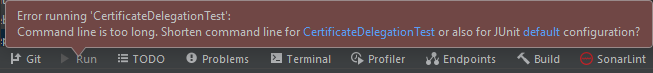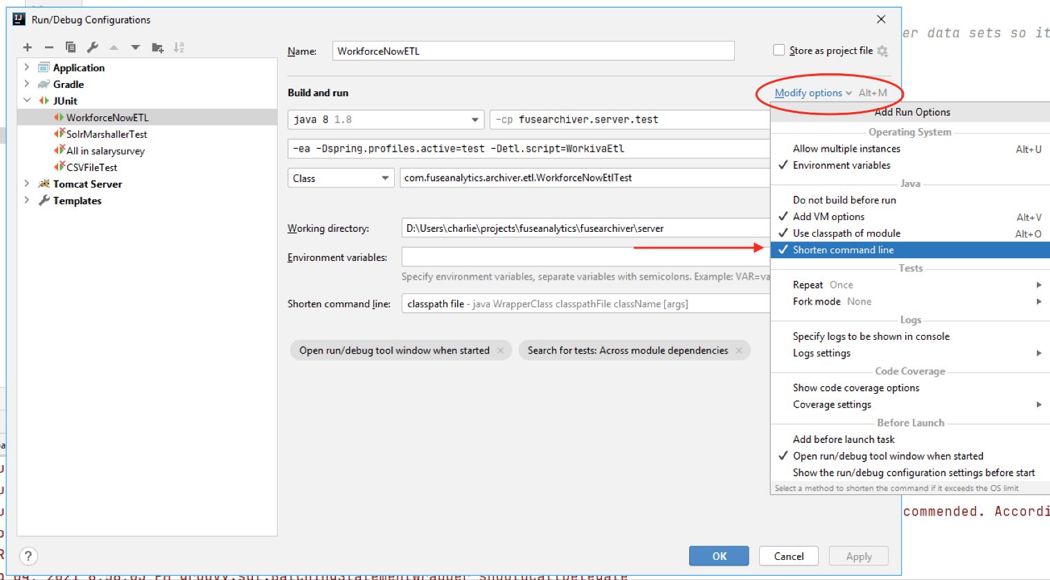 您可以通过选中“”菜单中的“缩短命令行”来缩短命令行,该菜单位于测试配置的"Build“选项卡”“下-如下所示。